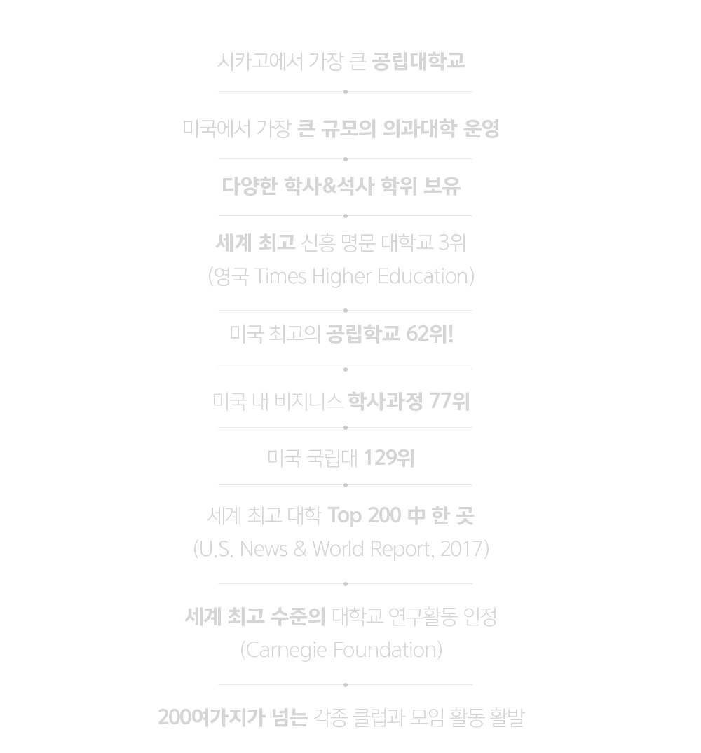±× Áß Æ¯È÷ ºñÁî´Ï½º °è¿ Çаú, Àǰú°¡ ƯÈ÷ À̸§À» ³¯¸®°í ÀÖ½À´Ï´Ù. ÀüÅëÀÌ ¾ÆÁÖ ¿À·¡µÈ Çб³´Â ¾Æ´Ô¿¡µµ ´ë´ÜÇÑ ¼ºÀåÀ» ÀÌ·ï³½ ¹Ì±¹ÁÖ¸³´ë ÀÔ´Ï´Ù. ¿µ±¹ÀÇ Times Higher Education ÀÌ ¼±Á¤ÇÑ ¼¼°è ÃÖ°í ½ÅÈï ¸í¹®´ëÇб³ 3À§¿¡ À̸§À» ¿Ã¸®±âµµ ÇßÀ¸¸ç, Carnegie Foundation ¿¡¼´Â ÃÖ°í ¼öÁØÀÇ ´ëÇб³ ¿¬±¸ Ȱµ¿À» ÀÎÁ¤¹Þ¾Ò½À´Ï´Ù. ½ÇÁ¦·Î UIC¿¡¼´Â ¿¬±¸È°µ¿À» ±²ÀåÈ÷ Ȱ¹ßÇÏ°Ô Çϰí ÀÖÀ¸¸ç, Çлýµé¿¡°Ô ¿¬±¸±âȸ¸¦ ¸¹ÀÌ Á¦°øÇϰí ÀÖ½À´Ï´Ù.