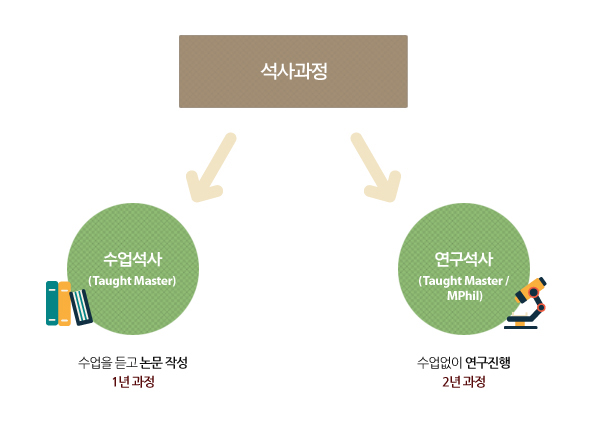 ¿µ±¹ ´ëÇпø °úÁ¤Àº ¼ö¾÷À» µè°í ³í¹®À» ¾²´Â ¼ö¾÷¼®»ç(Taught Master)1³â°úÁ¤°ú ¿¬±¸ °úÁ¤¸¸À¸·Î ÇÐÀ§¸¦ ÃëµæÇÏ´Â ¿¬±¸¼®»ç(Research Master)2³â °úÁ¤À¸·Î ³ª´¹´Ï´Ù. ¼ö¾÷¼®»ç °úÁ¤ÀÌ ´õ ÀϹÝÀûÀ̸ç Çѱ¹°ú ´Þ¸® 1³â¿¡ 3Çбâ·Î ¿î¿µÀÌ µË´Ï´Ù.